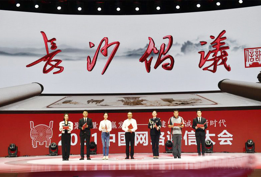 7月15日,2021中國網(wǎng)絡(luò)誠信大會開幕式現(xiàn)場,7位來自各行各業(yè)的網(wǎng)絡(luò)誠信宣傳大使,共同宣讀網(wǎng)絡(luò)誠信《長沙倡議》,吹響網(wǎng)絡(luò)誠信的號角。